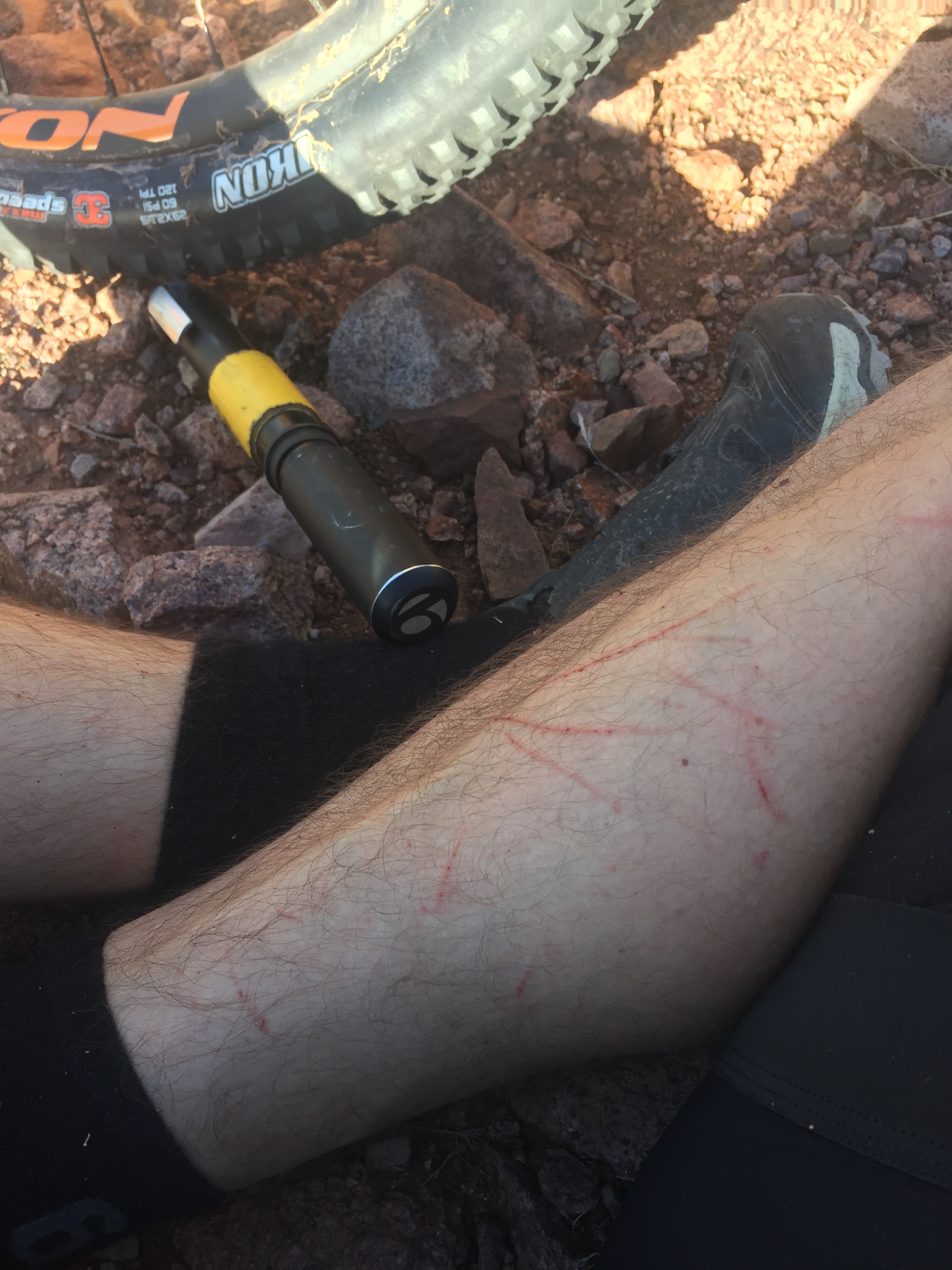 The Black Hills sort of gently went up and down giving a good intro to riding desert rock. Around mile 16 the trail dropped into a big wash that was pretty easy to find your through following the tire tracks of others. For those not familiar with the term "wash", it essentially a dry creek bed typically filled with pumice sand. Although they are normally dry, this is where all of the runoff from rain typically flows and you can see old striations through the wash where water has once run. Climbing out of the wash I made my way up another set of hills and then down a few steep drops with sharp rocks. On this descent I heard that sound of air escaping a tire.....a sound you really never want to hear. I stopped and checked it out. Big cut in the sidewall of my rear tire. Luckily I have been here before and knew how to handle it. I found a shady spot and proceeded to put a few stitches into a nice half inch cut. Threw a tube in it and was on my way. It was a very windy afternoon which had throw bits of cholla cactus all over the trail. This made me a little nervous given the freshly tubed rear tire lacking any sort of sealant to protect these little punctures.
