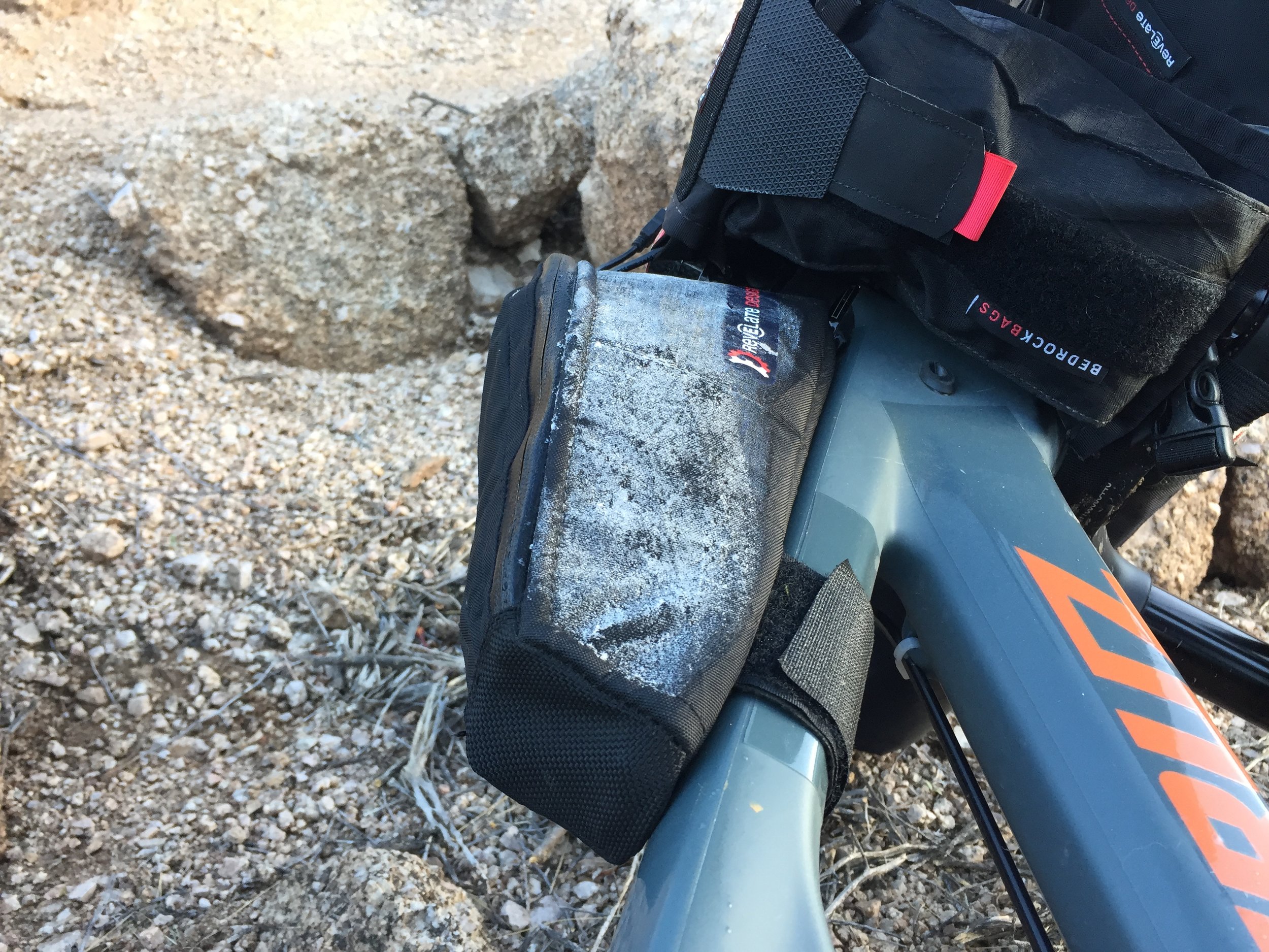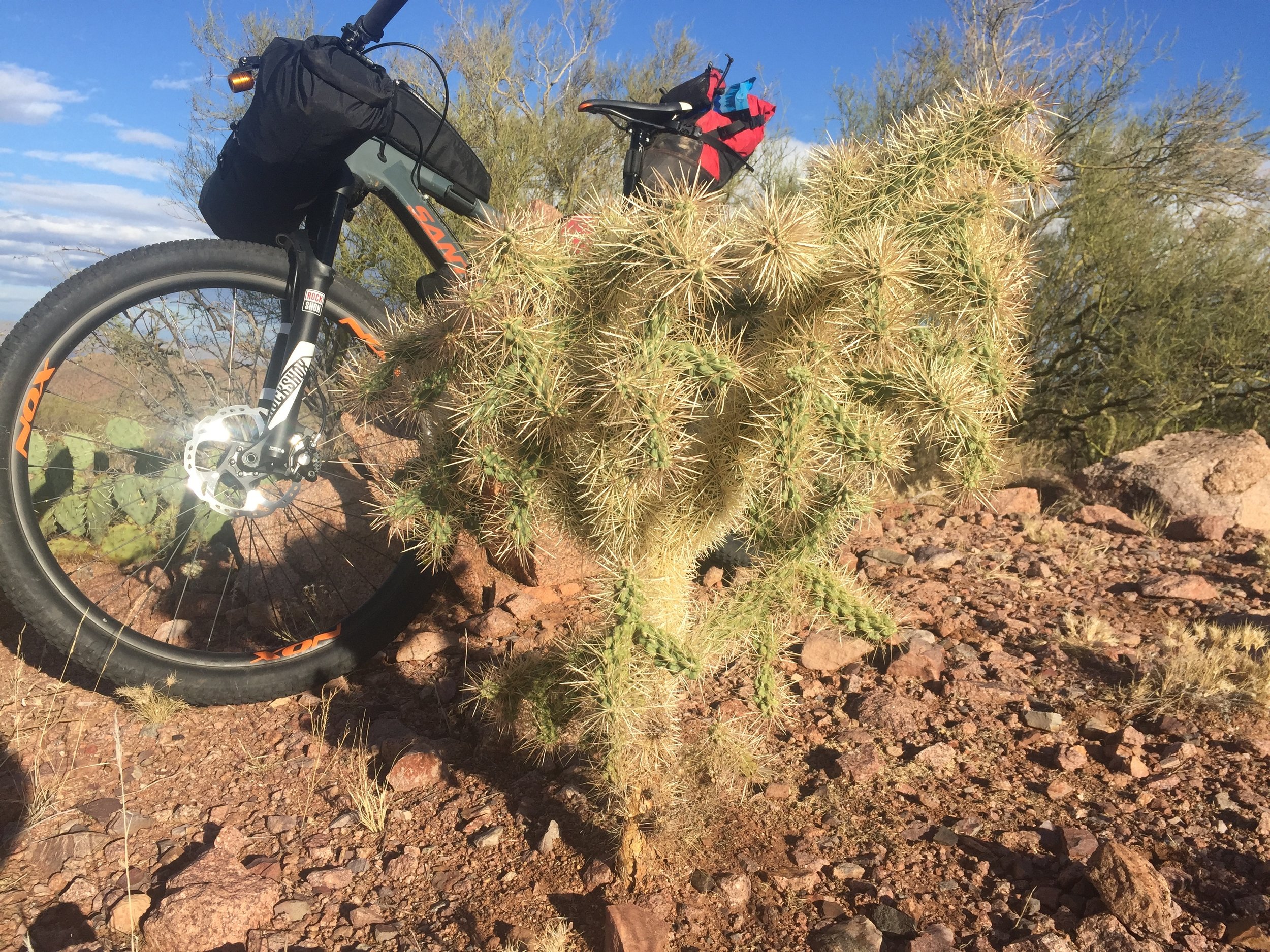 I woke up to a pretty awesome sunrise over the Gila but was freezing. There was a layer of frost over all of the bags on my bike and my 45F bag was not going to cut it in these conditions but I managed to stay pretty toasty wearing all of my camp clothes, thick wools socks and a down jacket. Today I would need to ride about 14 miles to knock out the Gila River passage then another 11 to descend into Picketpost. The elevation profile for the rest of this passage was a little intimidating but the morning started out pretty awesome continuing along the river. I decided to just start out with my normal cool weather clothes knowing that the temps would come up quick with the sun. This consisted of a craft base layer, bibs and Twin Six jersey adding on thin knee warmers and arm warmers. Handup Gloves for grip and protection from the pointy, pricky things of the desert worked great.