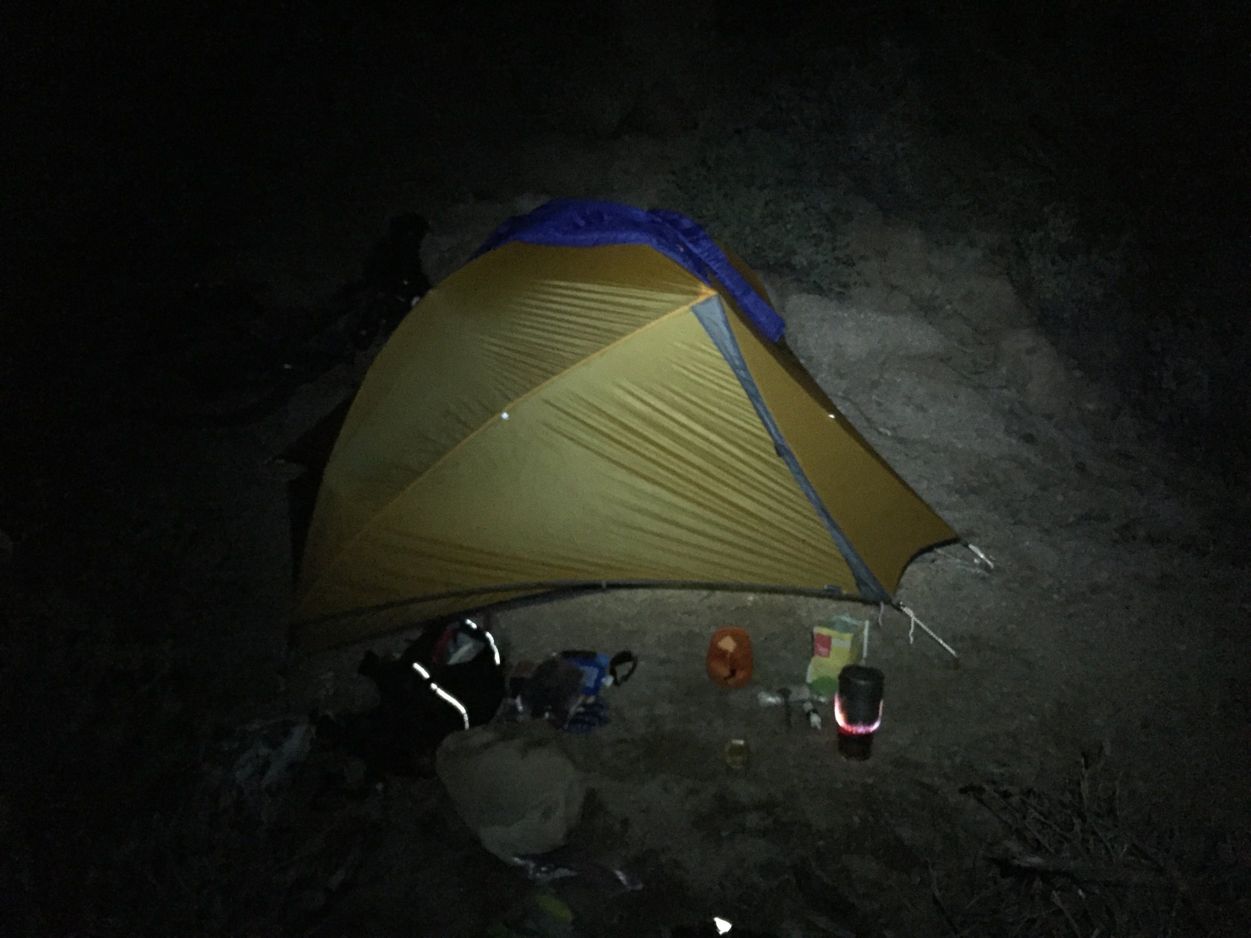 The sun was starting to set but I knew I had to be getting close to the Freeman Road trailhead. Just as I turned my lights on I had come to a road that was marked with the same name as the trailhead displayed on my Garmin. Crossing the road and continuing on trail for another half mile I ran right into the well signed outpost. Tons of bottled water sitting on a resupply box was a mental boost and I made quick work of setting up camp as the wind was picking up. The forecast for the weekend had changed a few times over the past couple of days so I didn't really know what to expect. As opposed to a lightweight race mode sleep kit, I decided to bring a full tent with me on this trip. I knew it was going to be a little chilly and I also wanted to embrace the pleasure cruise mode of this trip. I changed into camp clothes and started cooking up a hot meal. After eating I review the maps for tomorrow and tucked in pretty early trying to ignore the howling wind outside the tent. Around 11pm I heard the drip drop of rain and the wind was really starting to pick up. Waves of 40+ mph gusts would momentarily collapse the sidewall of my tent. The rain picked up into a downpour. I knew that I was at fairly high ground and didn't need to worry about being in danger of a flash flood. All night it went like this.....waves of storms rolling through. Tent stakes evidently do not hold into wet sand very well and I had to get out a few times and resecure them but I was super happy to be bone dry inside of my Nemo Blaze tent. I would nod off a here and there but didn't get a great night sleep. Sometime in the wee hours the rain stopped and I feel asleep not waking till the sun peeked through nylon folds.