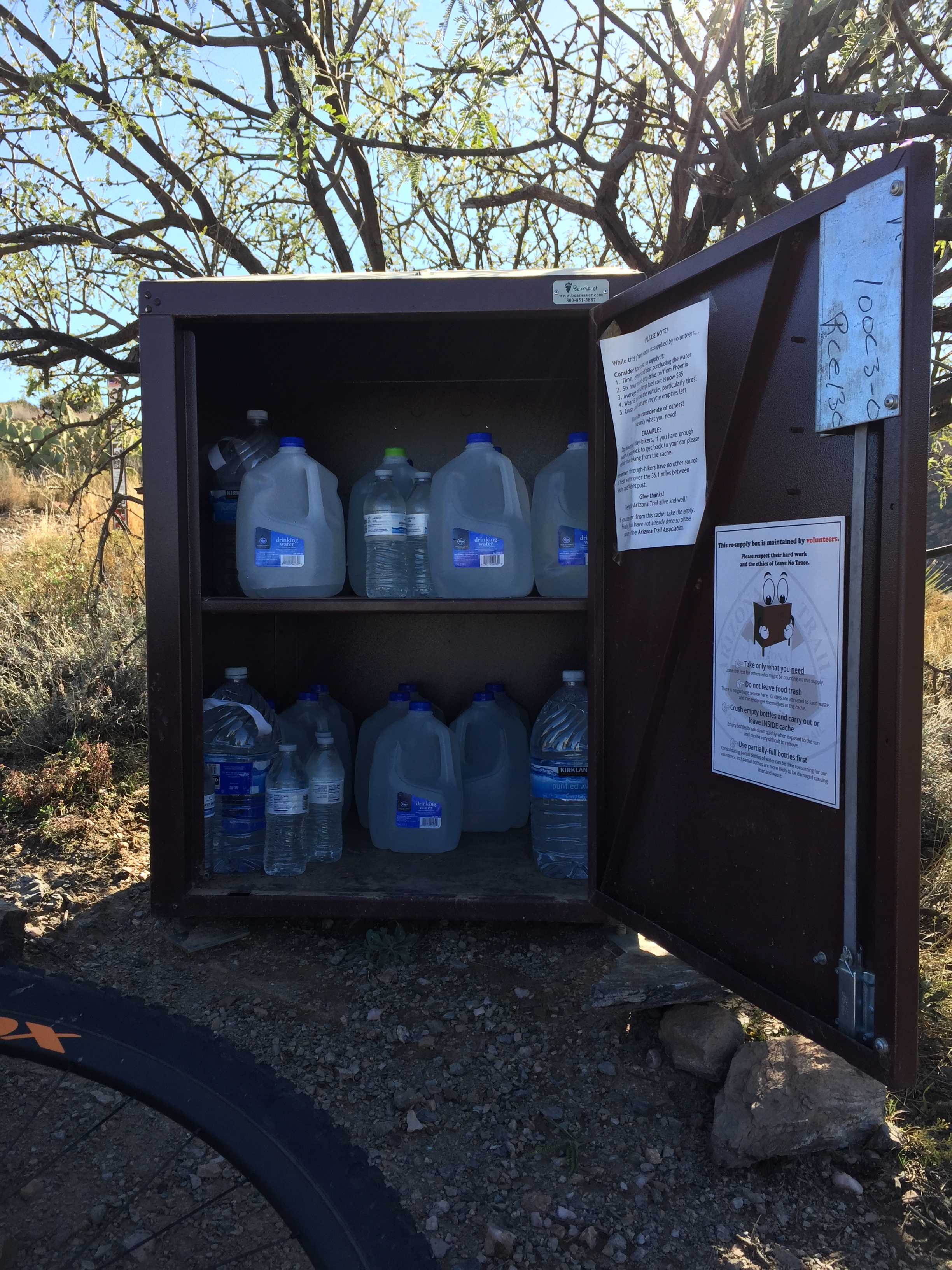 One distinct technical feature that I had to learn how to ride were the steep and extremely sharp switchbacks. The rocks were always very loose in these areas which made the turn all the more difficult. Some of them had a large rock at the apex that you could throw your inside foot onto as a pivot. This is going to be an area of skill development I will be spending a lot of time as I felt it killed my momentum ascending and descending these sections. I seemed to have a more difficult time with right handers versus left. Once topping the Big Hill, the descent towards Kelvin was relatively easy riding. I went slightly off-route after hitting pavement crossing the Gila River to refill on water at the Pinal County maintenance yard. Easy to find spigot of fresh, cool water.