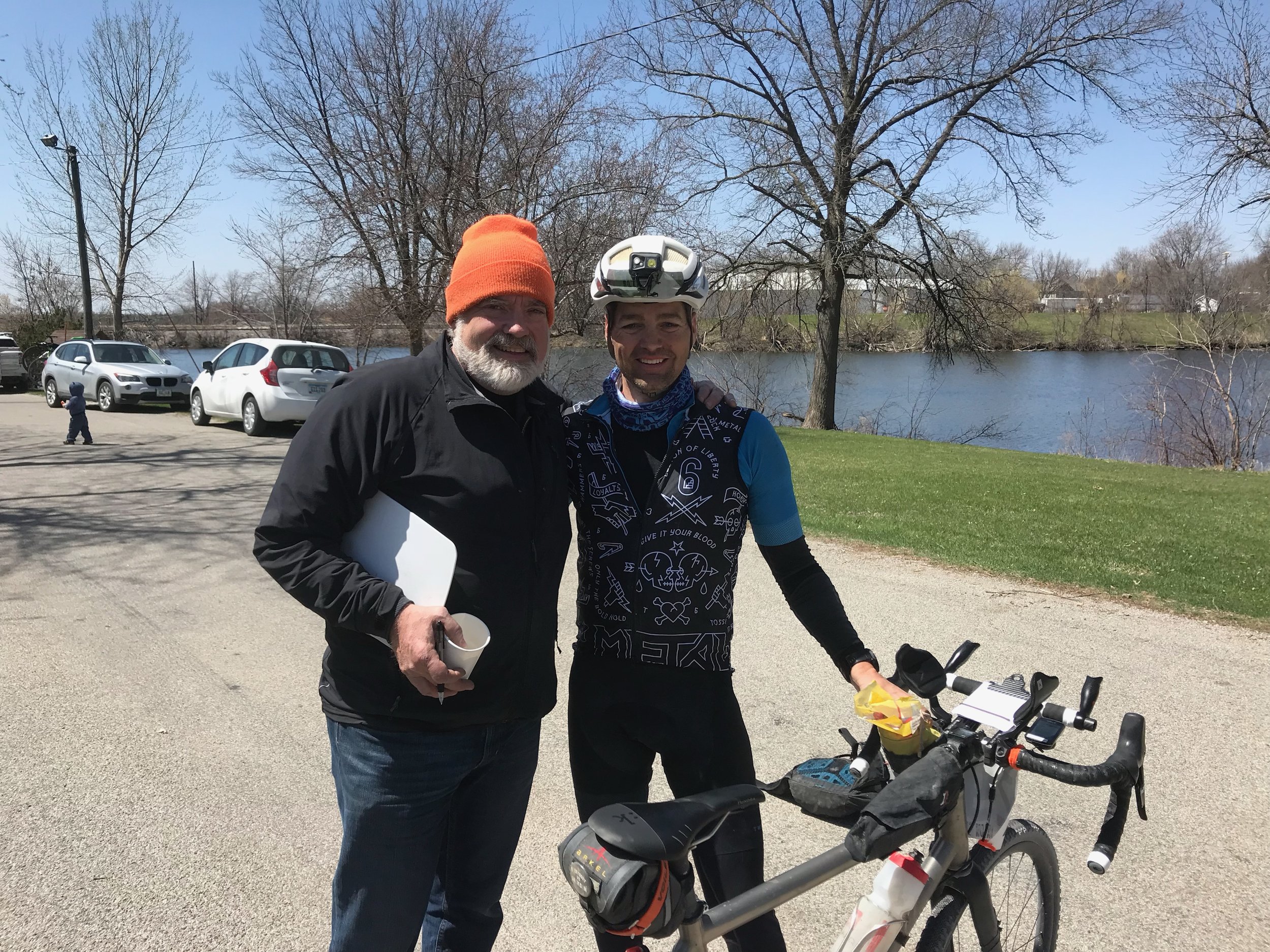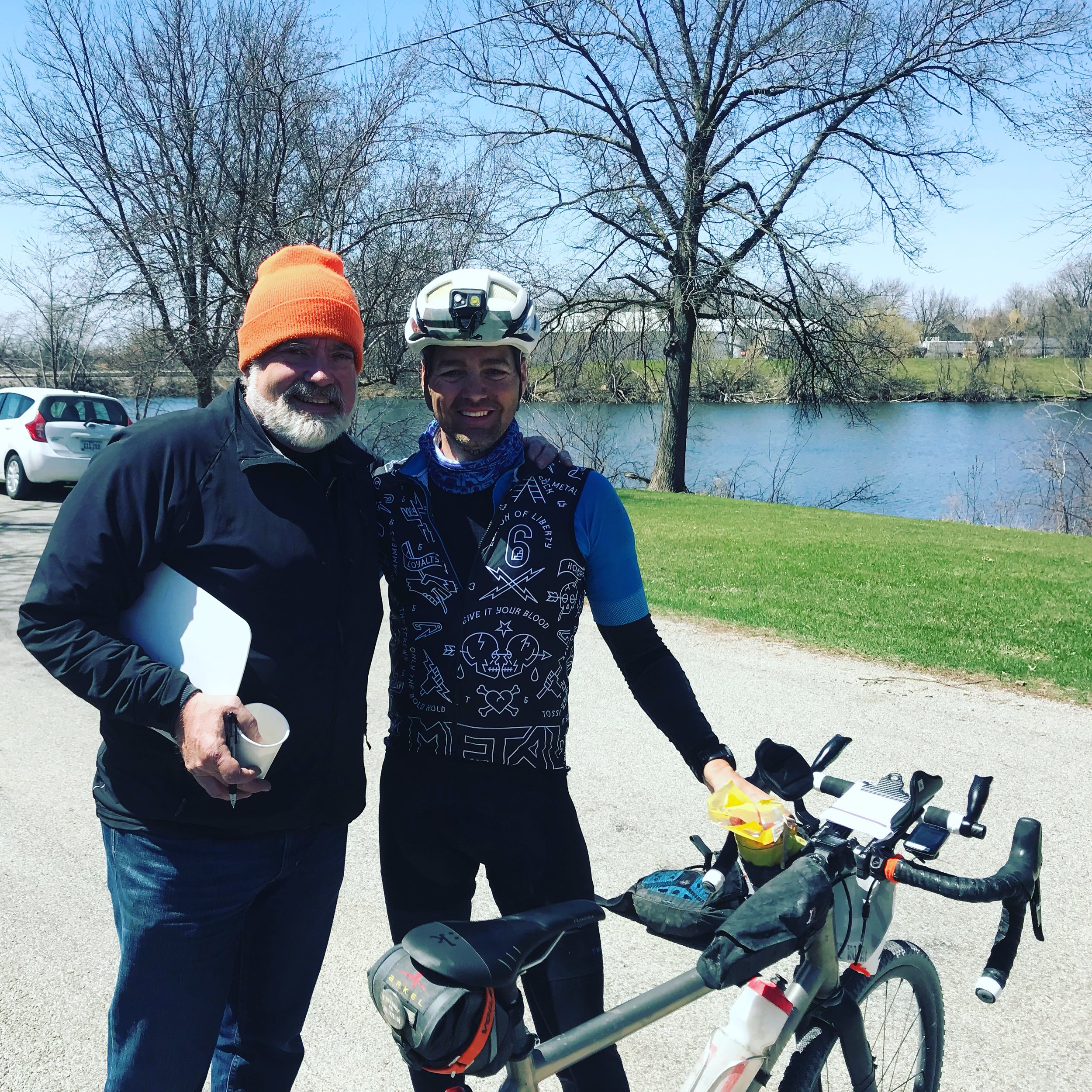 My trusty new friend Ken was there and I had him snap a pic of Mark and I before I retreated to the car to peel off the layers of clothes I have been wearing for the last day and a half. I grabbed a few pieces of fruit I had stashed in the car and a beer then rejoined the small group of folks hanging around the finish line telling stories of this and past versions of TransIowa. This bond is one thing I love so much about the ultra cycling community. Once you have done a few of these hard events you can immediately relate to anyone else who has done the same. It really doesn't matter how fast or slow you are.....there is an instant kinship. It was cool to meet Jess Rundlett and Scott Sumpter who run BIKEIOWA.COM dedicated to growing and advocating for all things cycling in Iowa. I was also surprised and stoked to hear that Scott was planning on heading south in August to take on Trans North Georgia.