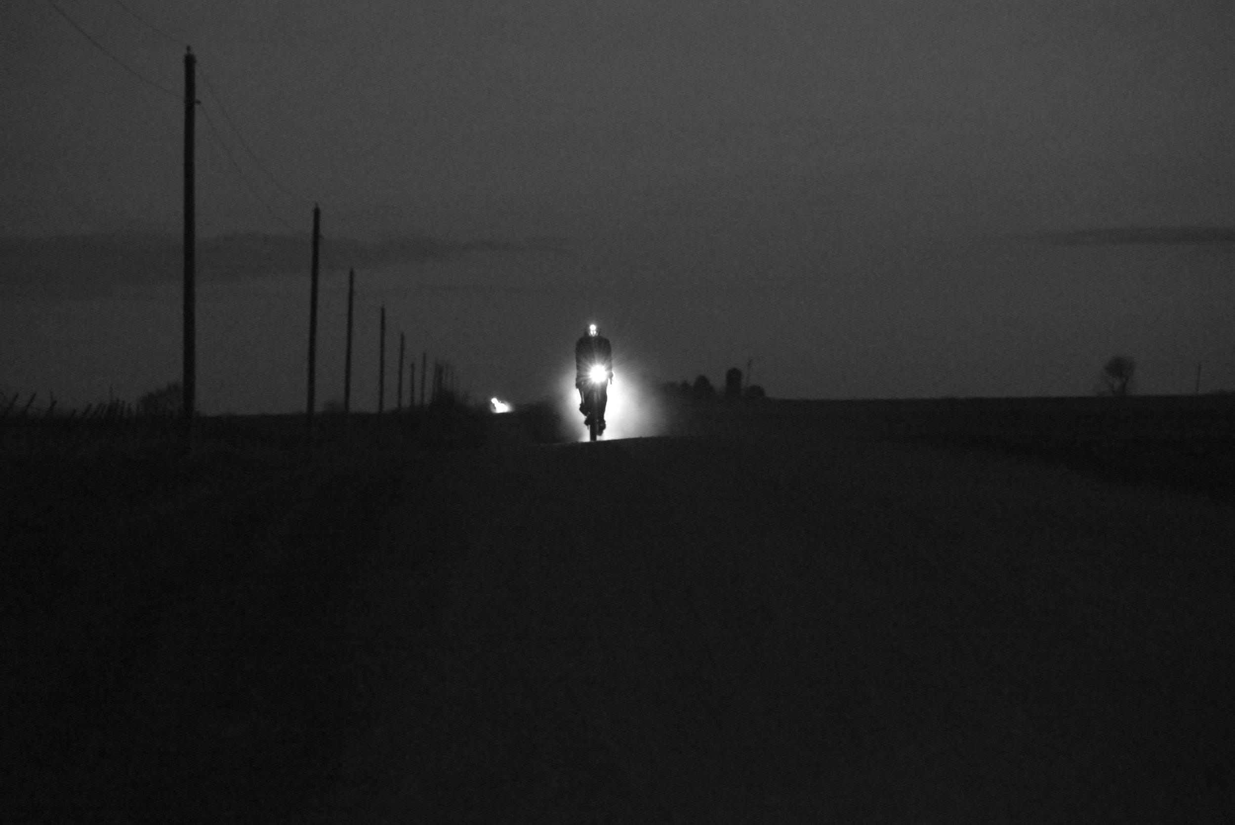 Night fell and my legs came alive. I was so looking forward to riding at night in order to have a bit of a change of scenery. The miles clicked by but the hills did not get any easier grinding out the tops of every crest with my knees starting to ache more and more. Right at 9:30 I rolled into the tiny little town of Webster which would be the second checkpoint of the race getting our last set of cue sheets to the finish. There were a number of volunteers there to check us in and help us unload trash and get back out on the road. It was starting to get a little chilly so I bundled up with leg warmers and my rain jacket. I also threw some grocery bags between my socks and shoes as a wind barrier in an attempt to keep my toes warm. Given the temps at the start and the forecast, I knew it was going to be a cold ride overnight into the next day. I filled up my water bottles and gave Wendi a call to chat for a few minutes before she tucked down for bed. It was a great lift to hear her voice. There were a number of riders that had made it to this checkpoint in time but were pulling out for one reason or another. I couldn't imagine getting this far and dropping but if you were battling a painful knee or were just not feeling it, this was most definitely the safe place to pull the plug. As I rolled out of the Webster checkpoint I thought I might want to give Ken a call letting him know I was riding strong and that I had made the cut-off.....should be no need for a bailout tonight, bro. Sleep well!