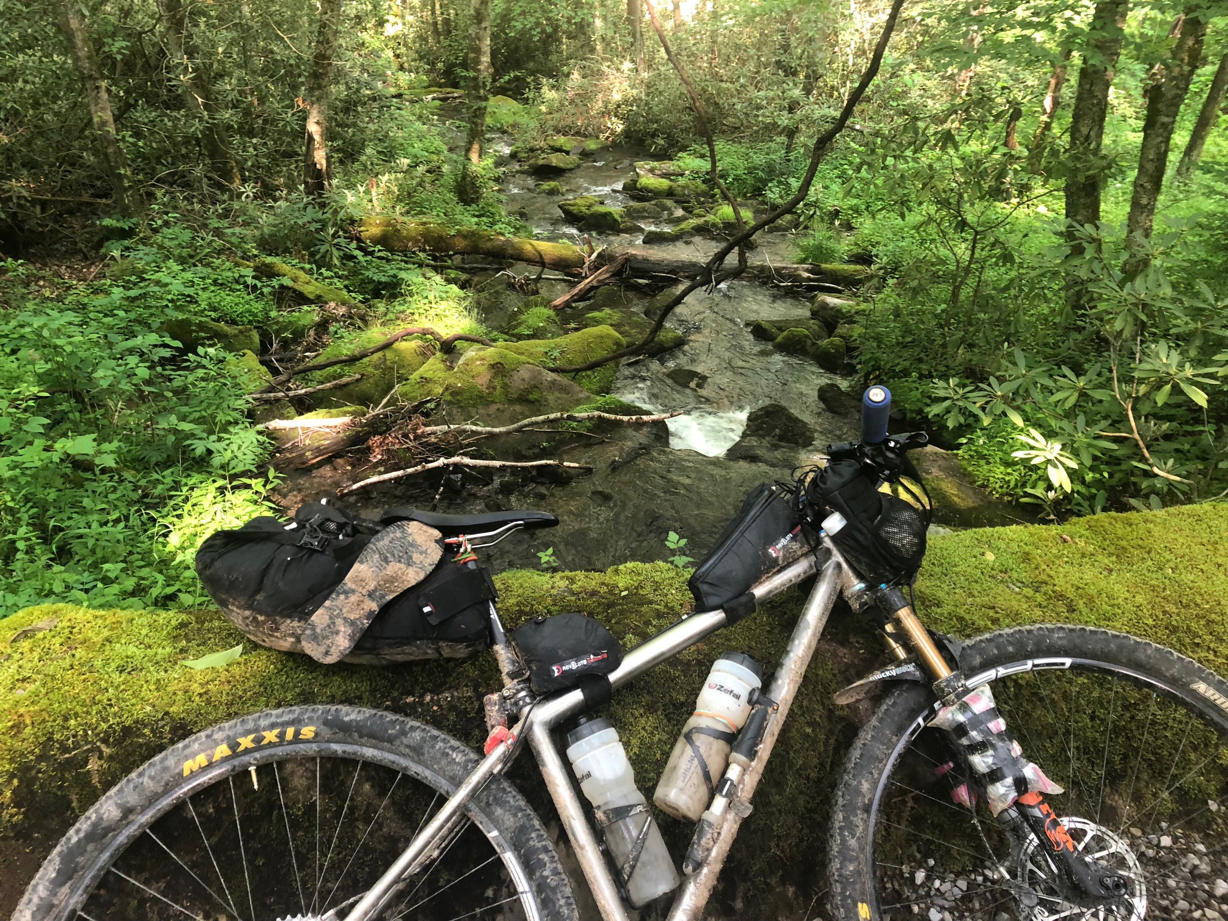 I rode my own pace and winding around, switchback after switchback, until I finally made it to the top. Good thing, too, because I was short on water. I drank all my water on that climb and was beginning to worry whether I would have enough. The climb took that long. I finally made it onto North River Road and it was a sweet little dirt rode downhill. Shaded and cool after being in the hot sun on that road for so long was a wonderful feeling. The first water source I came to, I pulled over to filter. It was a perfect filter spot. It was easy to get to, a small flowing waterfall so it filled my sawyer bag easily, and a perfectly placed ledge to sit my bottles on while they were waiting patiently to be refilled. I wasn't there long before Brent came tearing down the road. He needed water also and stopped to filter as well. We chatted again saying if we didn't see each other again than good luck. I finished up and went on my way. The downhill was a welcome sight! Finally reached the North River Check Station. This was where I was going to originally try and make it to the first night but, well, that obviously didn't happen. I stopped at the check station since they had a water pump and cleaned the mud off my legs and splashed the cool clean water over my face (Wow, how small things like that can change your attitude quick). It made me appreciate the small things in life. I walked around it and just took a minute to breathe and take in all that I had done so far and then moved on.