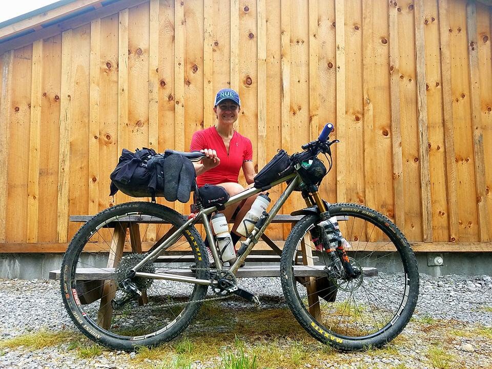 So on I went. I rode and I rode … and I rode, bike shifting like shit. I had only three gears, the 11 and 12 speed, thank goodness, and maybe one other. It wouldn’t stay in any other gear. I needed to change my bent derailleur hanger but was too tired to do any work on a bike so I just pressed on. As rode on through the night, I passed where Betsy was camping. I was delirious and falling asleep on my bike. As morning came I was in bad shape with sleep deprivation. All the trees became whatever my mind thought about. I sat in the road and laid over my bike and slept for 10 minutes at a time, setting my alarm. I stood, propping on my handlebars, catching winks of sleep here and there until my legs buckled, and woke me. Then I would push on. It was 12 miles from the finish that I started to go back to that dark place. Tired and exhausted, when the route went off the dirt road and up to the right onto some HAB single track, I almost lost it. Pretty sure I was cussing to no one but myself. It was one climb after another until literally the finish. I was elated to see the end. Done and done after a 26 hour pull with no sleep when I rolled up at Flip-Flop Burgers, finishing in 73 hours and 30 mins. … first among the women, with Betsy not far behind me.