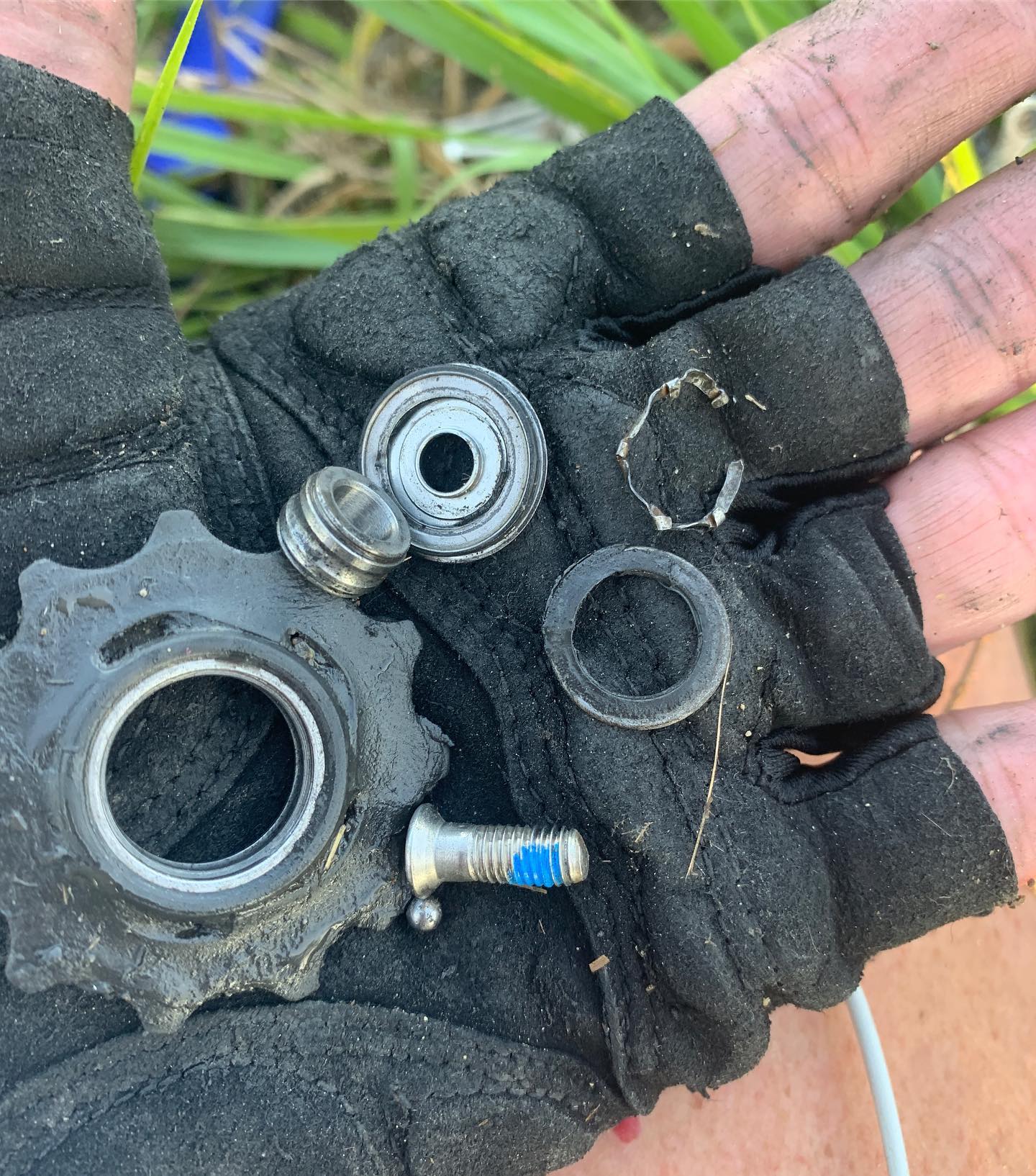 Mile 14.2 - I can’t pedal. The chain won’t move. I pull over and inspect my bike, but I can’t see anything missing or stuck in the chain. I pick up the bike wheel and try to move the crank, and the whole derailleur pulls back against the back wheel. After a few more tries, I see that the bottom jockey wheel isn’t spinning. It’s frozen. I take the back wheel off and try to clean the frozen piece with my fingernails, try to make it spin, but no dice. I decide to take it off the bike to work on it some more, and as soon as I do it disintegrates into pieces in my hand. My ride is over an hour and a half after it started.