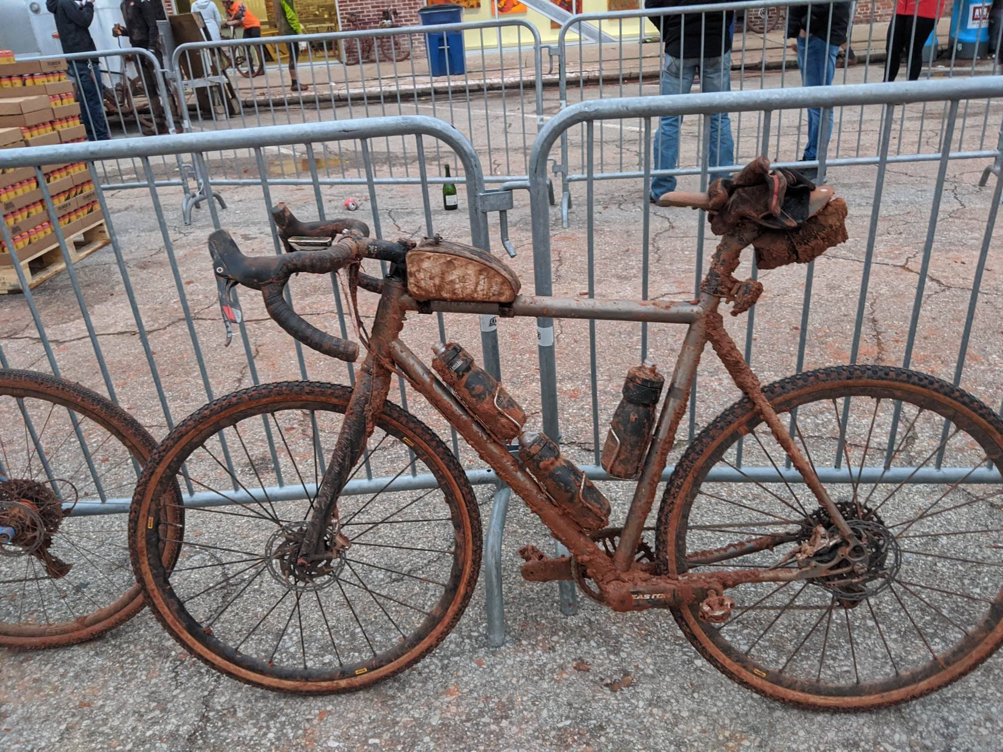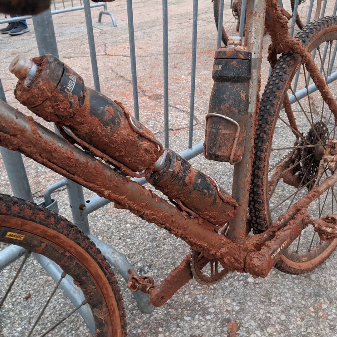 The mud was still like peanut butter mixed with Play-Doh. It was nasty. But we powered on. To avoid more mechanicals, we started walking through the really thick stuff. Bike over shoulder, shoes with 5 lbs of mud each, folks slipping and sliding all over the place, bikes loaded with mud on the side of the road.