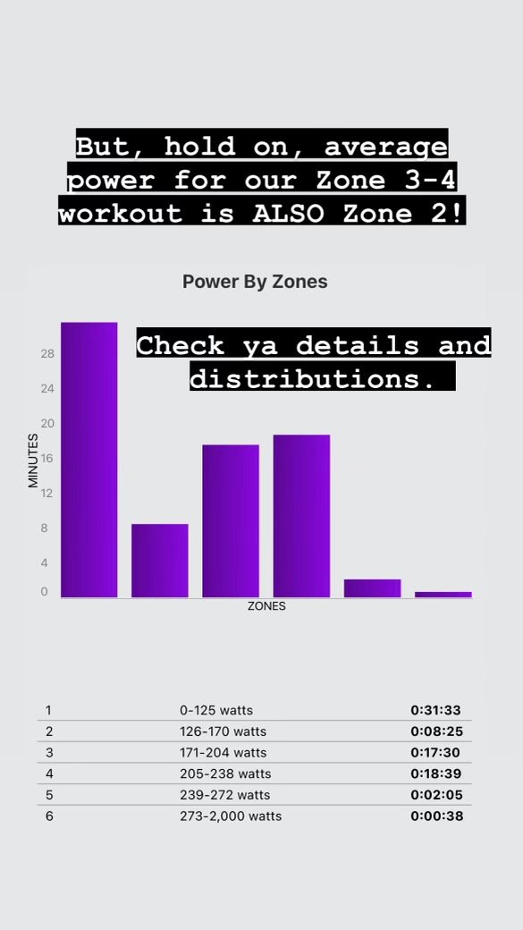 Metrics Take a look at the comparison photos below. These illustrate how deceptive power and heart rate averages can be if you don’t look at the context of the actual zone distribution in the ride! Check over your Zone 2 rides when done to be sure you actually did one. It is easy to see 0.70 IF (Intensity Factor) pop up after a ride and think you did a Zone 2 ride when you didn’t. Stay in tune with your body during the ride. On some days, you will feel awesome and naturally ride stronger. Other days, you won’t be able to do as much. Every day is its own, so do your best on that day. Temperature, cloud cover and hydration status can influence heart rate. Many riders find their heart rate drifting upwards during the ride. This drift tends to decrease as you do more of these rides.